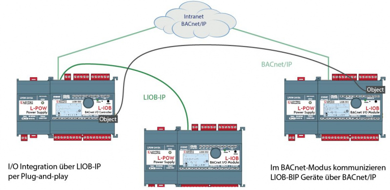 Die LIOB-55x I/O Module kommunizieren über Ethernet/IP im BACnet/IP- und BACnet/SC-Netzwerk. Sie erfüllen das BACnet Building Controller Profil (B-BC) und stellen ihre I/O Datenpunkte entweder über BACnet-Server-Objekte zur Verfügung oder die L-IOB Module holen sich aktiv die Datenpunktwerte per BACnet Client Maps von einem BACnet-Server.