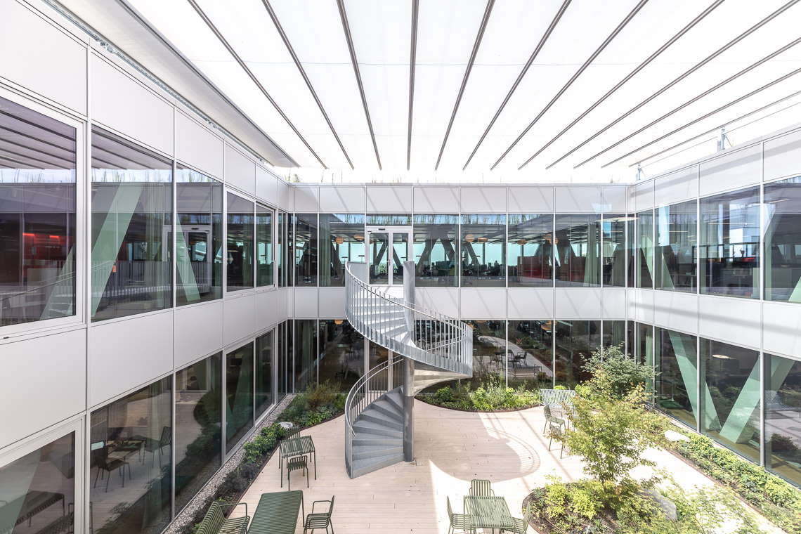 The building features an energy center, housing a large heat pump and a reversible refrigeration machine for heating and cooling water preparation. The energy for this is extracted from the ground using geothermal probes and fed back into the system. In addition to the waste heat from refrigeration production, the waste heat from the air compressors is also used in an energy-efficient manner. Heat and cold are supplied to the individual floors via riser zones and distributed on these floors via ring pipes so that the energy is available for air conditioning the rooms throughout the building.