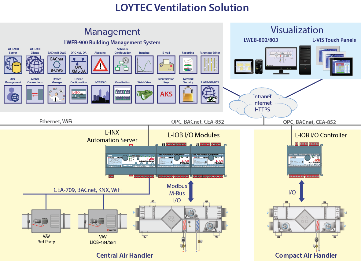於屋頂的中央空調箱安裝大型通風系統,為業務與辦公室樓層提供空調。為充分地配送空調而部署變風量控制器(VAV),藉由通風系統功能的最佳化來調整最佳作業情況。L-INX自動化伺服器透過L-IOB I/O模組和多種現場總線,整合致動器與感測器來達成控制。建築的外面架設了氣象站,透過現場總線與L-INX自動化伺服器通訊。